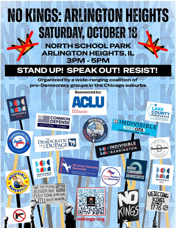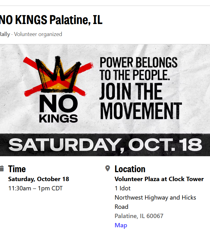 The Local Rally is at 11:30 a.m. Saturday, Oct. 18 at the Palatine Clock Tower. This rally is organized by local volunteers. Visit here to sign up for the Palatine No Kings Rally https://www.mobilize.us/nokings/event/847364/?referring_vol=1882987&rname=Maria&share_context=event_details&share_medium=copy_linkPalahttps://www.mobilize.us/nokings/event/847364/?referring_vol=1882987&rname=Maria&share_context=event_details&share_medium=copy_link