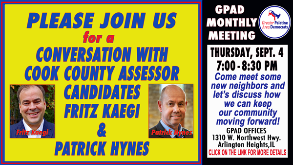 Who can best deliver fair assessments to the property owners of Cook County? The Cook County Assessor is the office that sets a value for nearly 2 million parcels of real estate in Cook County, the second largest county in the nation. At this meeting we'll hear from two candidates: Incumbent Fritz Kaegi and challenger Patrick Hynes, Lyons Township Assessor with thirty years of public service working for three Cook County Assessors. Pat Hynes is endorsed by the Cook County Democratic Party. Come hear from both candidates on their plans to address unfairness in the property tax system.