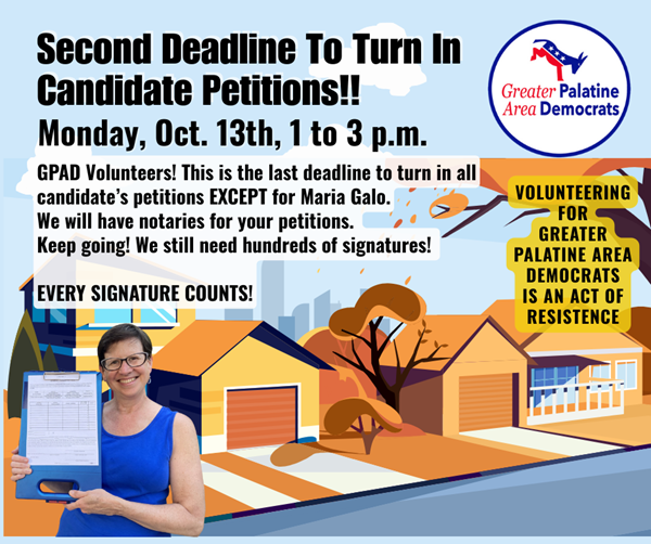 This is the last day to turn in petitions for all candidates except for Maria Galo for Palatine Township Committeeperson. Bring your petitions to the GPAD office and we will notarize them. We are getting very close to our goals!! Keep going, everyone!!!