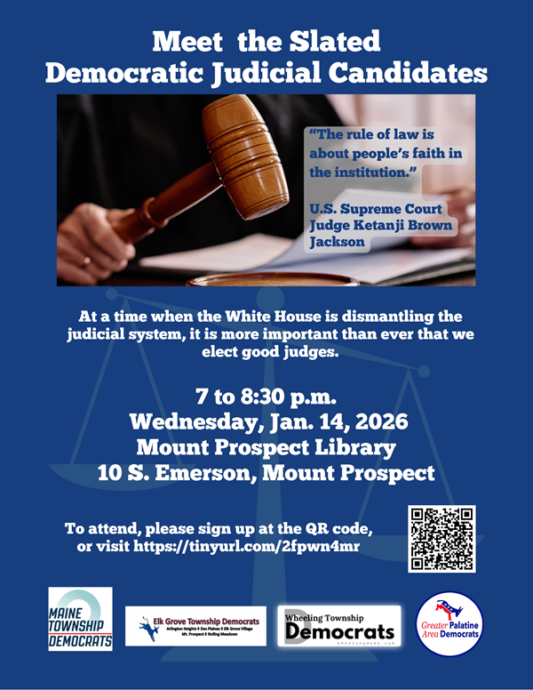 At a time when the White House is attacking the legitimacy of our court and legal system, electing good judges becomes most important. Come out to Mount Prospect Library to meet the slated Democratic judicial candidates for county judge. You'll have a chance to learn from them their own stories about why they want to be a Cook County Judge, and why they are the best candidates for judge.