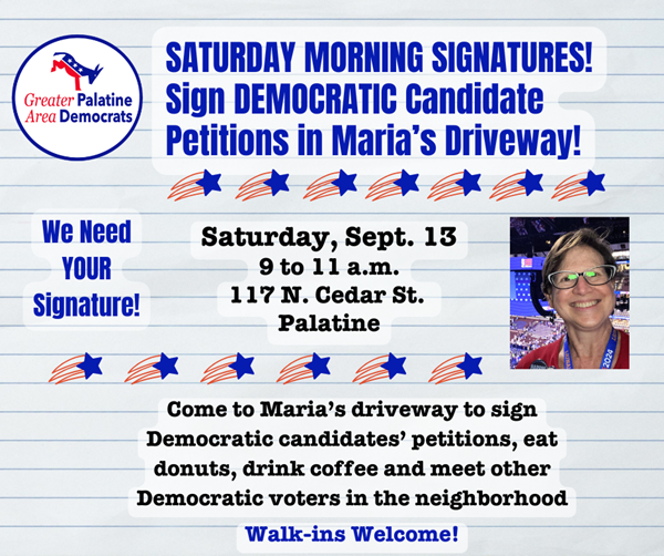 Come out to Maria's driveway to sign Democratic Candidates' Petitions. Have a donut, some coffee and meet other Democrats and progressives in the neighborhood. This is how we protect democracy, one signature at a time.